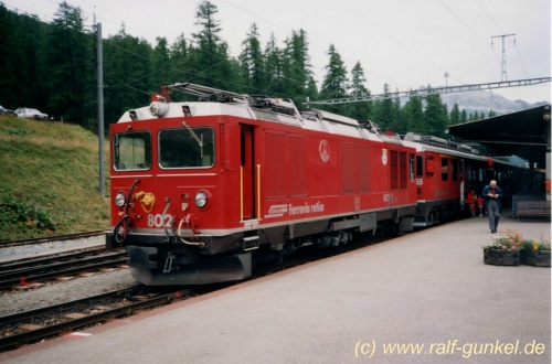 Gem 4/4 802 (Schmalpurlok mit Diesel und Elekrtomotor) leistet in Pontresina Vorspanndienste vor einem Berninazug.