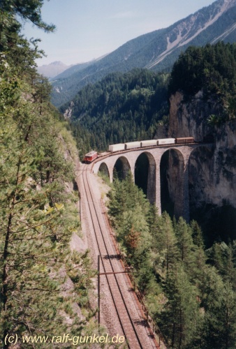 Güterzug mit Schiebewandwagen und Ge 6/6 II auf dem Landwasserviadukt.