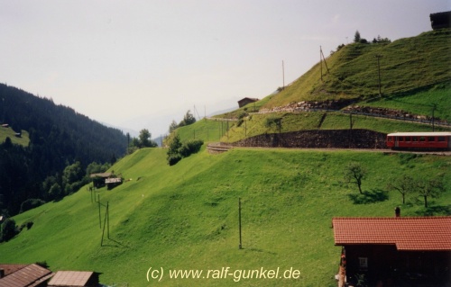 Nein es ist kein entgegenkommender Zug. Dies ist die Zugspitze die sich bei Langwies durch die engen Radien quält
