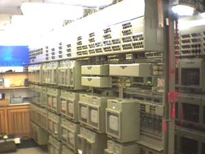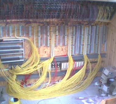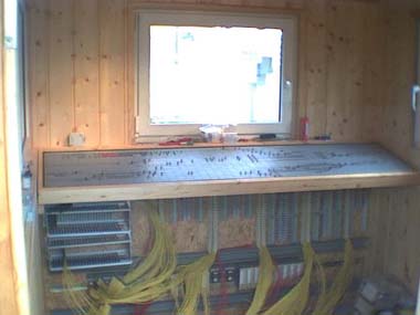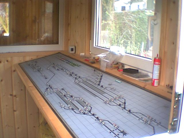 Das Stellwerk: Das Herz der Anlage befindet sich derzeit im Aufbau und wird im Endzustand alle notwendigen Versorgungs- und Steuereinrichtungen für einen fast vollautomatischen Betrieb beinhalten. Aber bis dort hin ist es noch ein weiter Weg! Wichstigste Komponenten sind ein Stelltisch der Fa. Minitec nach Vorbild eines SpDrS 60 Stelltisch der DB, eine Siemens S5 95U SPS-Steuerung und jede Mene "selbstgestrickte" Plantinen für die multiplexverarbeitung der Ein- und Ausgänge. Die Steuerung muß ca. 360 Ein- und ca. 860 Ausgänge verarbeiten wobei der größte Teil von Ausgängen für die Tischausleuchtung benötigt wird. | |||||||||||||||||||||||||||||||||||||||||||||||||||||||||||||||||||||||||||||||||||