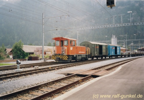 Ein Tmf 2/2 kümmert sich im Bf Thusis um die Stückgutwagen der dortigen Kunden